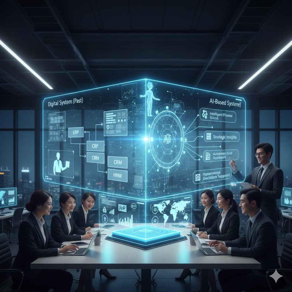 *우리의 주제 경영 시스템에서의 AX에 대해 살펴보면 경영 시스템의 AX는 기존의 ERP(전사적 자원관리), CRM(고객 관리), HRM(인 전자원 관리)고 같은 경영 도구에 AI를 도입 결합하여 자율적인 경영 시스템으로 전환하는 과정을 의미한다.