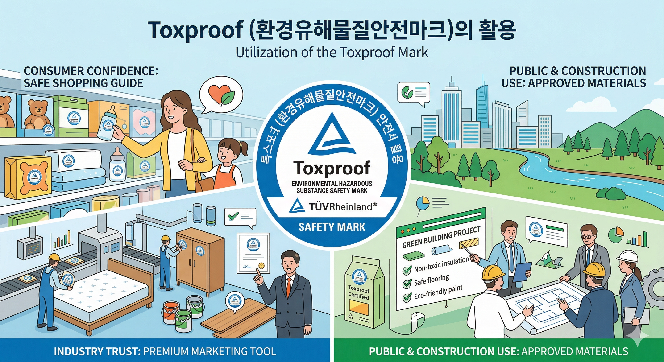 *Toxproof(환경유해 물질 안전마크)는 기업에게는 강력한 제품 안정 보증서이며 마케팅 도구로, 소비자에게는 나와 가족을 지키는 강력한 방패로 활용된다.