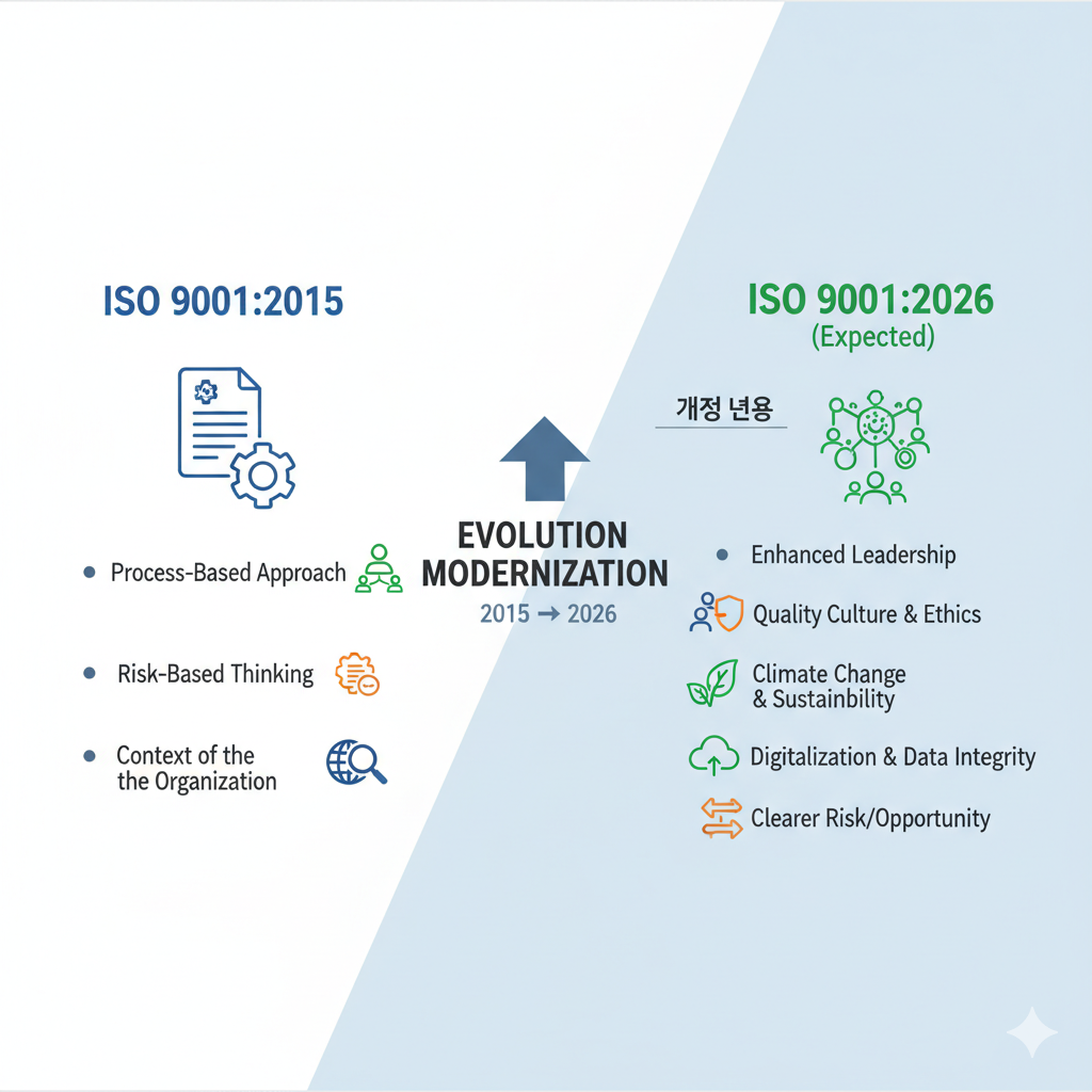 ISO 9001 품질 경영 시스템은 2026년 새로운 개정을 발표한다. 현재 개정 초안은 발표가 되어 있는 상태이고 이 개정 초안을 바탕으로 2026년 하반기 정도 새로운 개정이 발표가 된다. ISO 9001 기존 인증을 받았던 조직들 또한 새로운 개정에 맞추어 업데이트 및 인증을 갱신해야 한다.